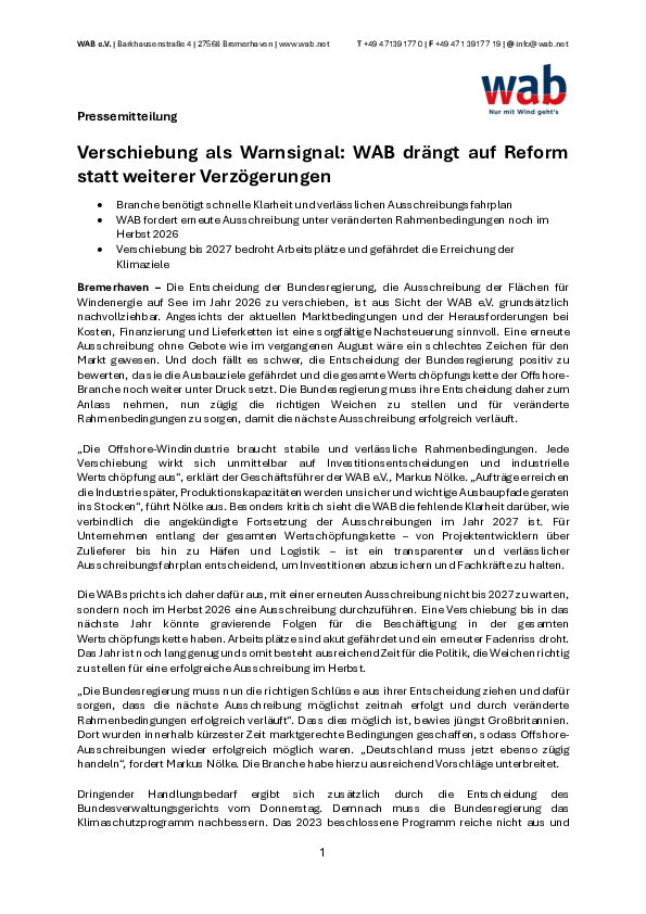 Bremerhaven – Die Entscheidung der Bundesregierung, die Ausschreibung der Flächen für Windenergie auf See im Jahr 2026 zu verschieben, ist aus Sicht der WAB e.V. grundsätzlich nachvollziehbar. Angesichts der aktuellen Marktbedingungen und der Herausforderungen bei Kosten, Finanzierung und Lieferketten ist eine sorgfältige Nachsteuerung sinnvoll.Eine erneute Ausschreibung ohne Gebote wie im vergangenen August wäre ein schlechtes Zeichen für den Markt gewesen. Und doch fällt es schwer, die Entscheidung der Bundesregierung positiv zu bewerten, da sie die Ausbauziele gefährdet und die gesamte Wertschöpfungskette der Offshore-Branche noch weiter unter Druck setzt. Die Bundesregierung muss ihre Entscheidung daher zum Anlass nehmen, nun zügig die richtigen Weichen zu stellen und für veränderte Rahmenbedingungen zu sorgen, damit die nächste Ausschreibung erfolgreich verläuft.